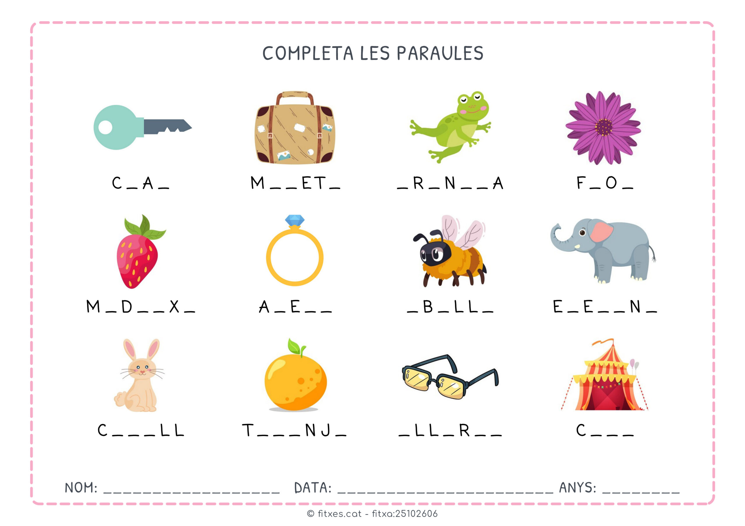 Aquí trobaràs fitxes en català per completar paraules amb lletres que falten. Cada paraula va acompanyada d’una imatge per ajudar els infants a reconèixer-la visualment i escriure-la correctament. Aquestes activitats són ideals per treballar la lectura i l’escriptura a 1r de Primària d’una manera divertida. Pots descarregar el PDF i imprimir-lo per fer a casa o a l’aula.