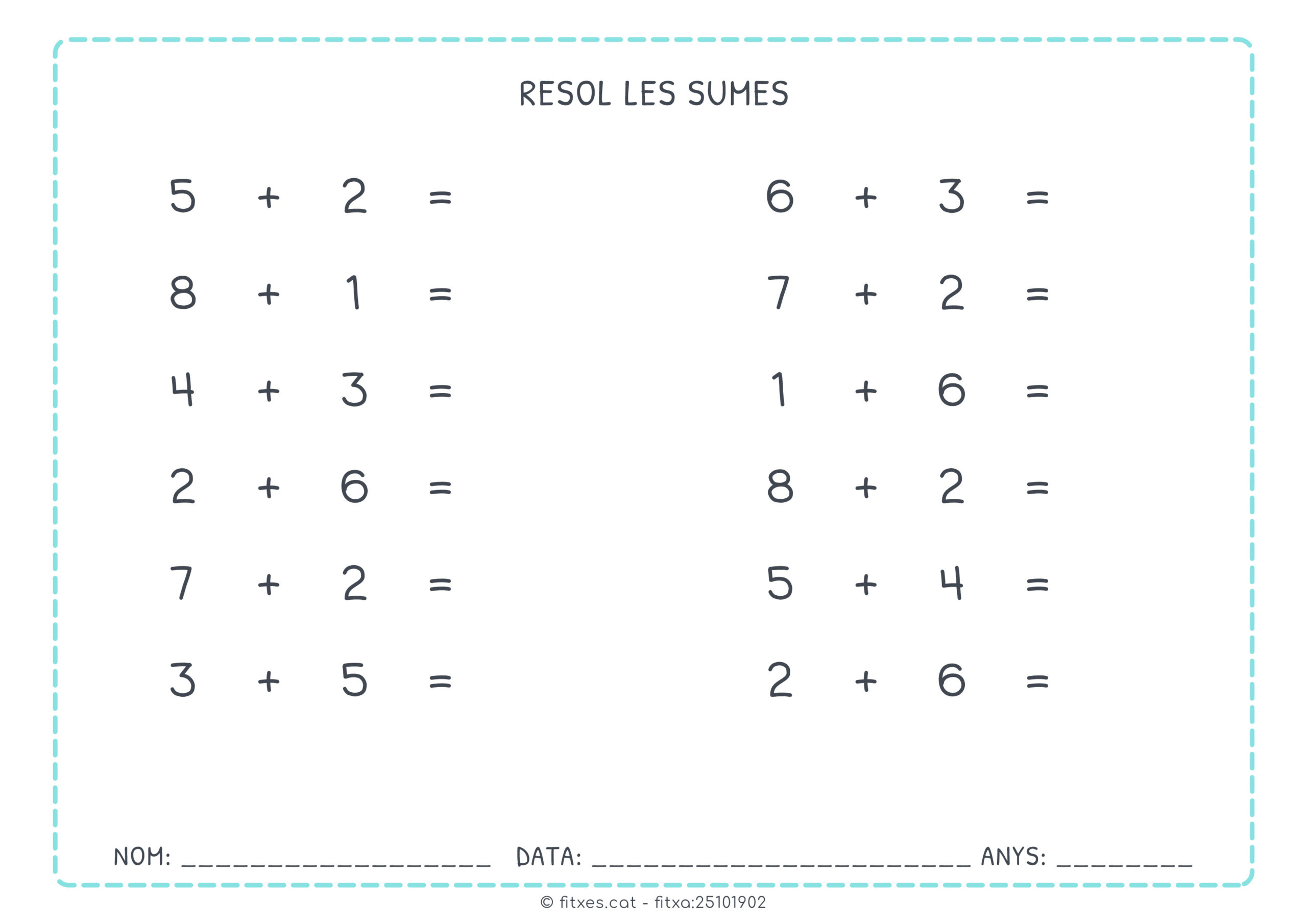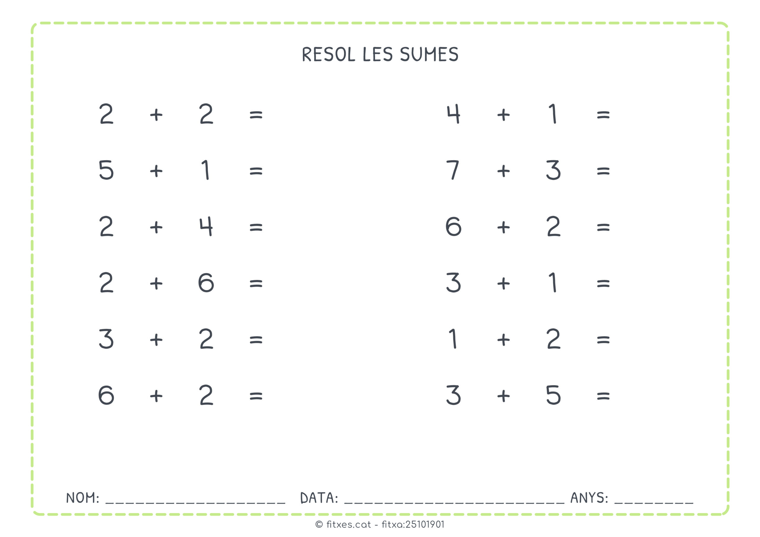 Aquestes fitxes de sumes senzilles estan pensades per a alumnes de 1r de Primària. Pots descarregar-les en format PDF per imprimir i practicar a casa o a l’aula.
