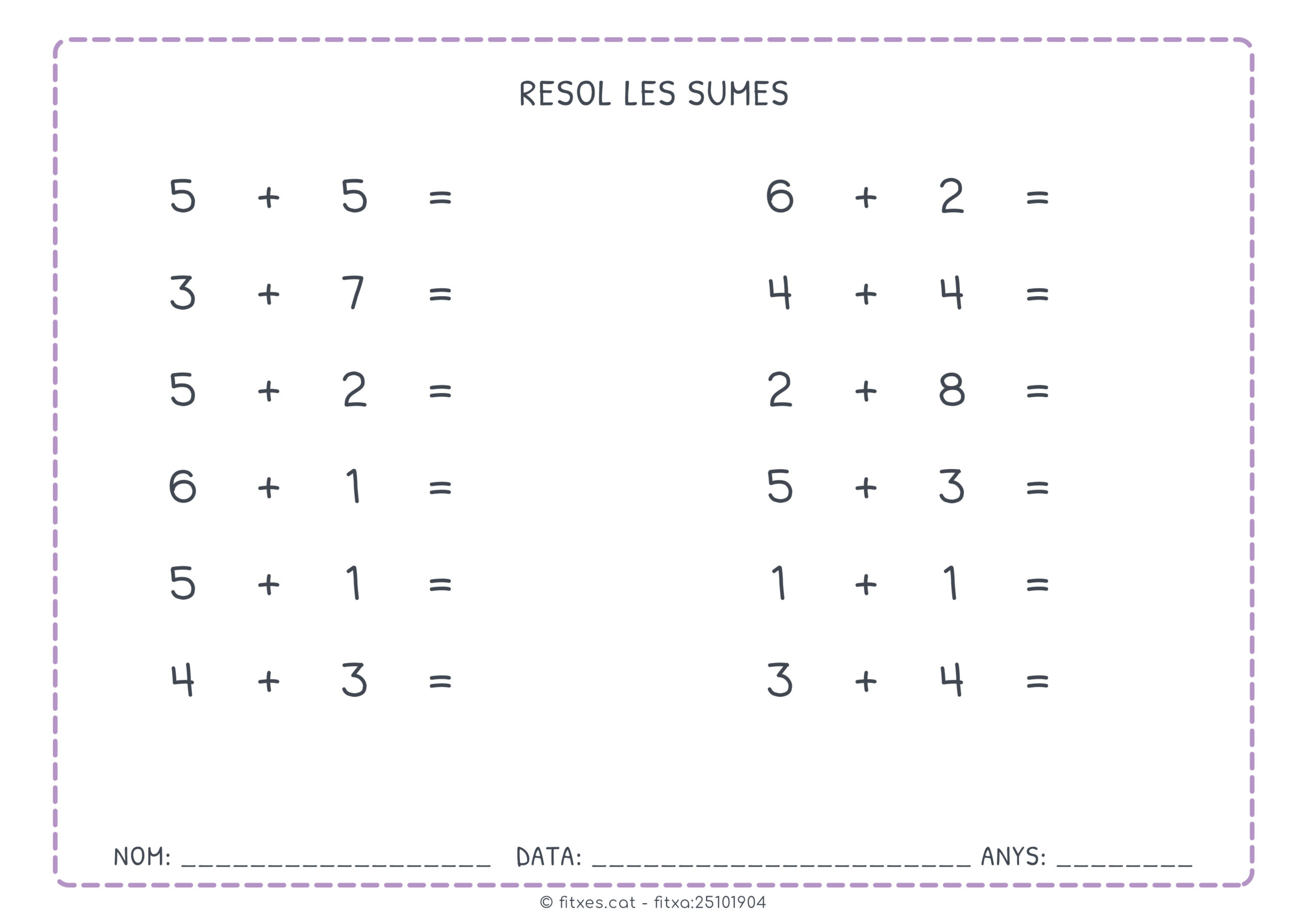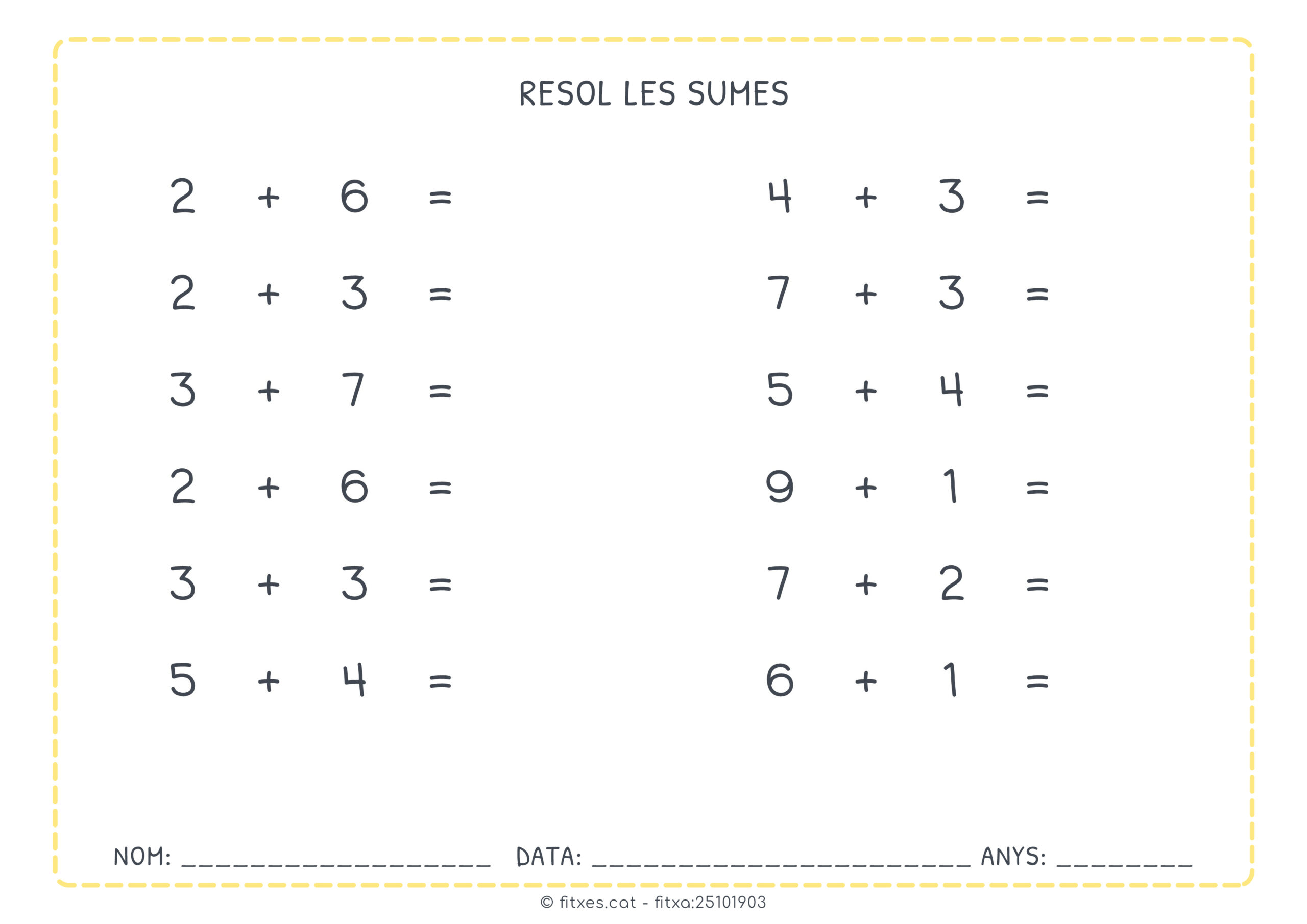 Fitxa de sumes fins a 10 per a 1r (en català), per imprimir.